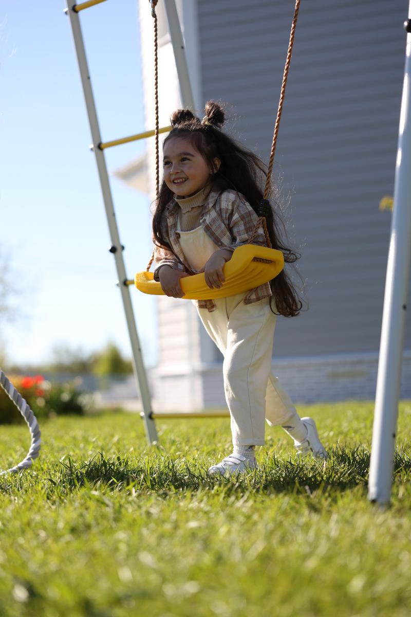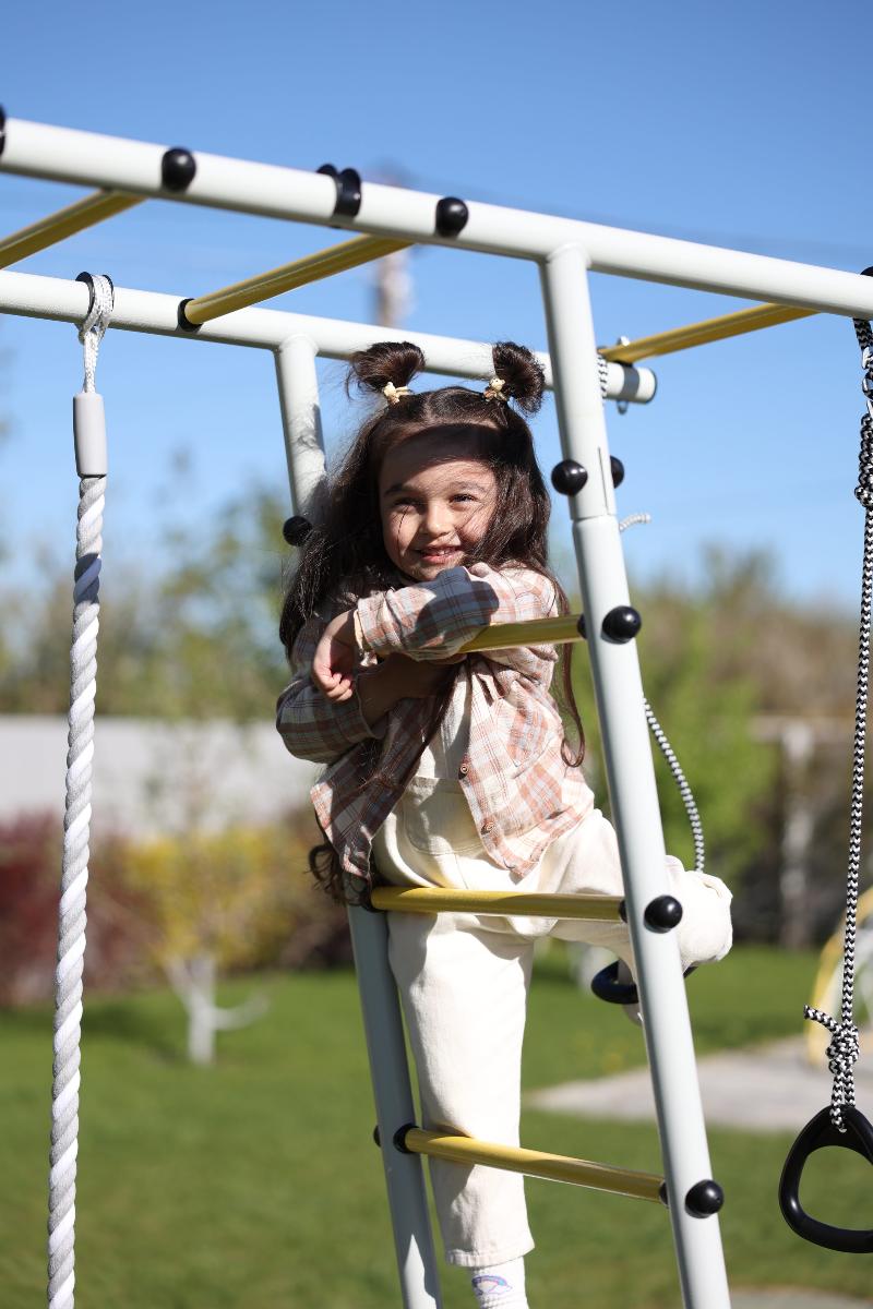 Конструкция спортивного комплекса обладает высокой прочностью и безопасностью для детей и взрослых, обеспечивая надежные условия для совместных занятий. Допустимая нагрузка на комплекс с турником и рукоходом составляет 100 кг, а на детское навесное оборудование - до 50 кг.