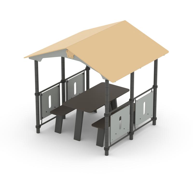 Беседка представляет собой сборно-разборную прямоугольную конструкцию с двумя входами, с ограждениями, столом и двумя сидениями, расположенными по двум сторонам беседки. Входы расположены с двух противоположных сторон беседки. Двускатная крыша беседки разборная и имеет наличники.