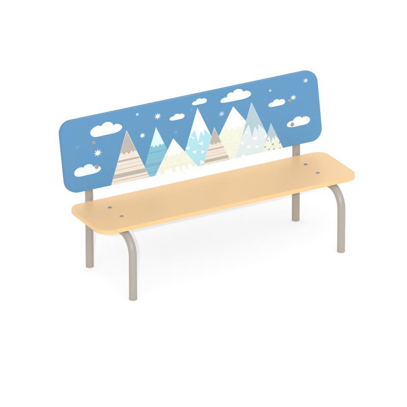 Скамья детская «Romana 302.09.00» двухцветная детская скамейка со спинкой для детских площадок, спортивных городков, детских садов. Спинка изделия декорирована рисунком «Горы», выполненным «УФ»-печатью.
