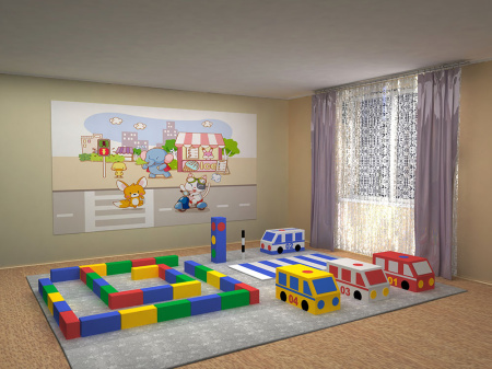 Набор представляет собой тематический комплекс в виде автопарка, в комплект входят следующие элементы: скорая помощь, пожарная машина, газовая служба, мини-лабиринт (состоит из 30 мягких модулей разных цветов), игровой набор «Грамотный пешеход» (включает в себя следующие мягкие модули: пешеходная дорожка, полицейская машина, регулировочный жезл и сфетофор).