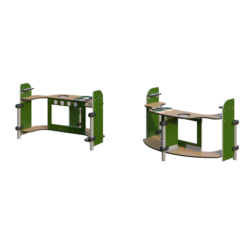 Конструкция оснащена множеством интерактивных элементов: круглыми накладками разного диаметра, отверстиями и пазами для развития моторики. Антивандальное исполнение и устойчивость к погодным условиям обеспечивают долговечность модуля. Конструкция легко монтируется на бетонное основание или раму, становясь центром притяжения для юных поваров на любой игровой площадке. Безопасность модели подтверждена соответствием ГОСТ Р 52169-2012.