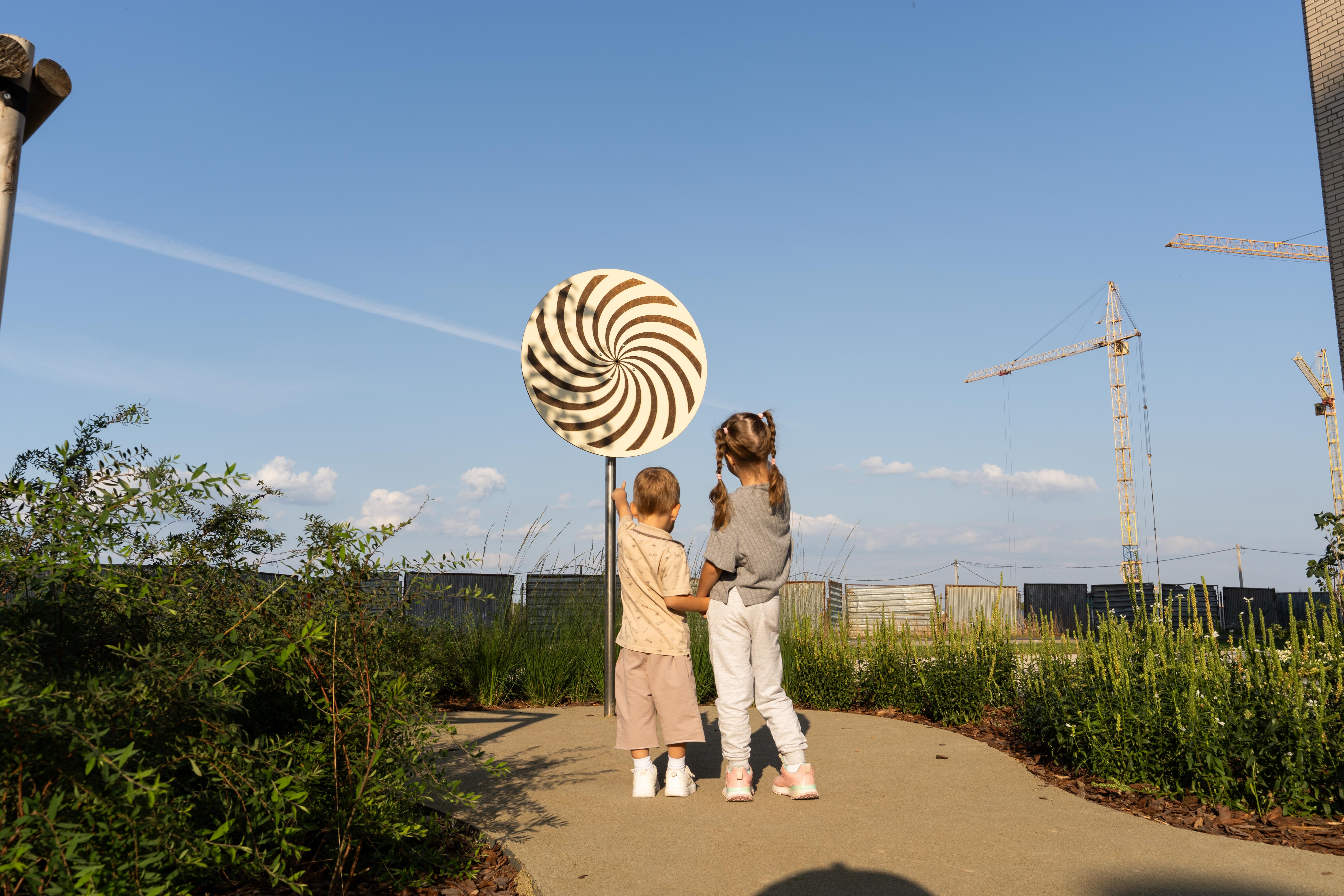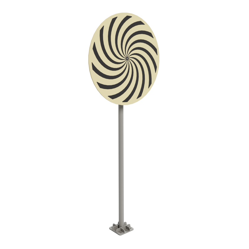 Изделие представляет собой конструкцию из труб и листового пластика. Материал стойки - нержавеющая сталь, круг - панель из HPL-пластика с рисунком.