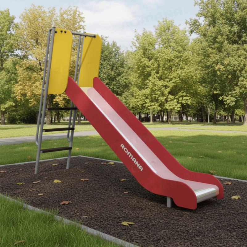 Горка предназначена для размещения на территориях детских дошкольных учреждений, парков, в дворах и местах общественного отдыха с целью организации досуга и гармоничного развития детей в возрасте от 6 до 12 лет. Может эксплуатироваться круглогодично во всех климатических зонах.Горка представляет собой металлическую лестницу c фанерными ступенями, площадку, ограждения площадки и скат. Горка имеет стартовую площадку, полосу скольжения и полосу торможения. В целях безопасности на стартовом участке горки предусмотрены защитные боковые экраны. Высота горки составляет 1250 мм.
