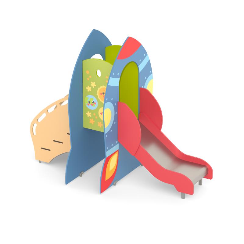 Горка предназначена для детей в возрасте от 4 до 8 лет.Горка состоит из лестницы входной, с помощью которой можно попасть на площадку с выходом на горку, и горки высотой ската 650 мм. Площадка с двух сторон имеет декоративные ограждения, оформленные в виде ракеты, обеспечивающие безопасное нахождение детей на игровом изделии. Горка имеет стартовую площадку, полосу скольжения и полосу торможения. В целях безопасности на стартовом участке горки предусмотрены защитные боковые экраны.