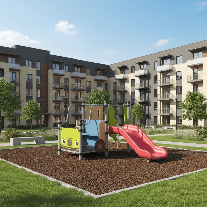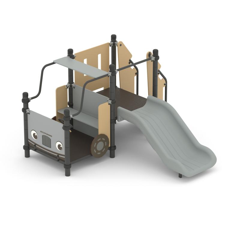 Игровой комплекс состоит из двух площадок. Первая площадка выполнена в виде кабины, имеет сиденье и руль. Вторая площадка выполнена в виде кузова и располагается на высоте 650 мм. от уровня поверхности площадки. К ней присоединяются лестница и горка.