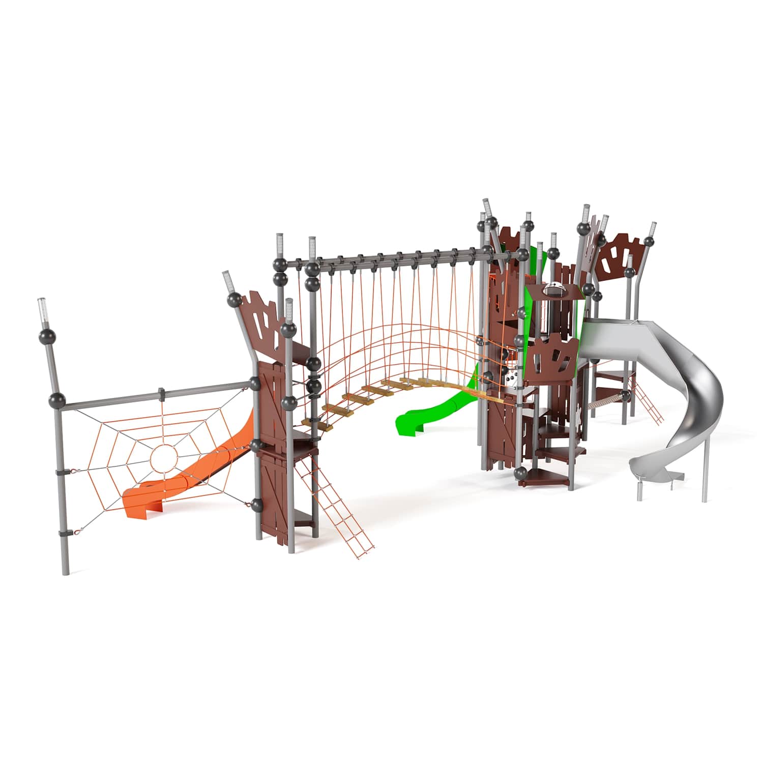 Каркас - сталь конструкционная, покрытие - цинкосодержащий грунт, окраска полимерным порошком. Горки, скаты - сталь нержавеющая толщиной не менее 2 мм, электрохимическая пассивация сварных швов. Панели, ограждения - полипропилен/HPL. Канатные сети, лазы, ограждения - канат армированный 16 мм. Подсветка комплекса - светильники на солнечной батарее.