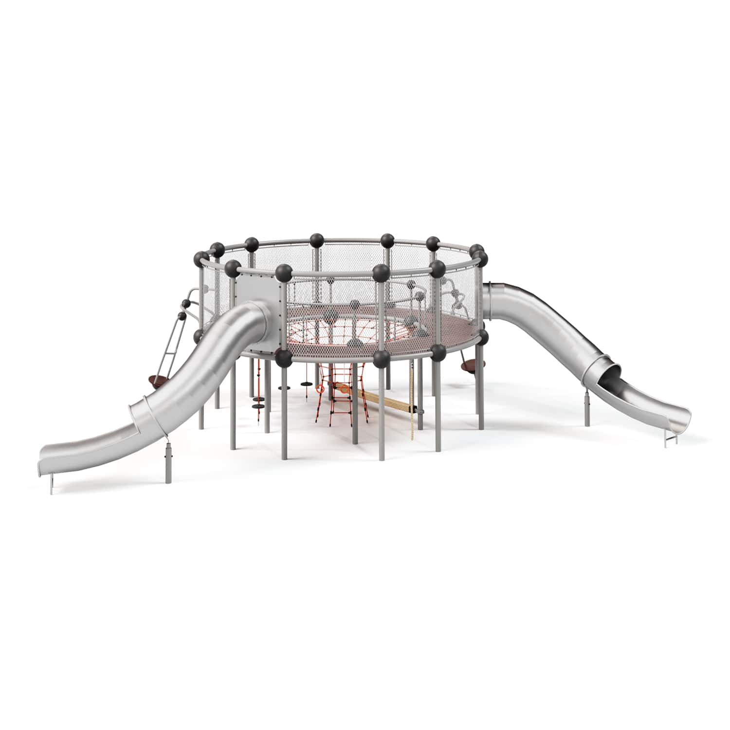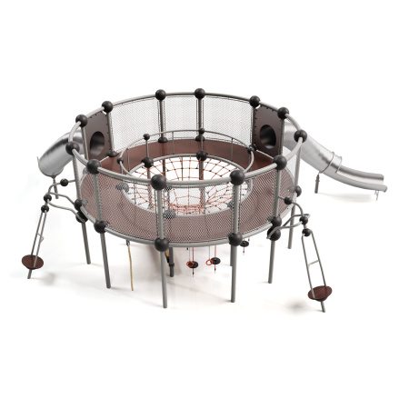 Каркас - сталь конструкционная, покрытие - цинкосодержащий грунт, окраска полимерным порошком. Горки - сталь нержавеющая толщиной не менее 2 мм, электрохимическая пассивация сварных швов. Панели, ограждения - полипропилен/HPL коричневого цвета. Канатные сети, лазы, ограждения - канат армированный 16 мм.