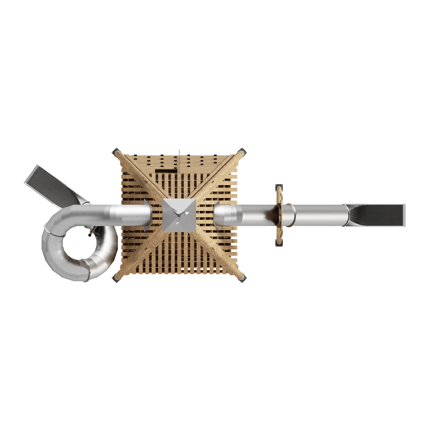Каркас, обшивка - дерево, обработанное антисептиком и маслом террасным атмосферостойким для древесины в 2 слоя. Горка - сталь нержавеющая толщиной не менее 2 мм, электрохимическая пассивация сварных швов. Зацепы - пескобетонный композит.