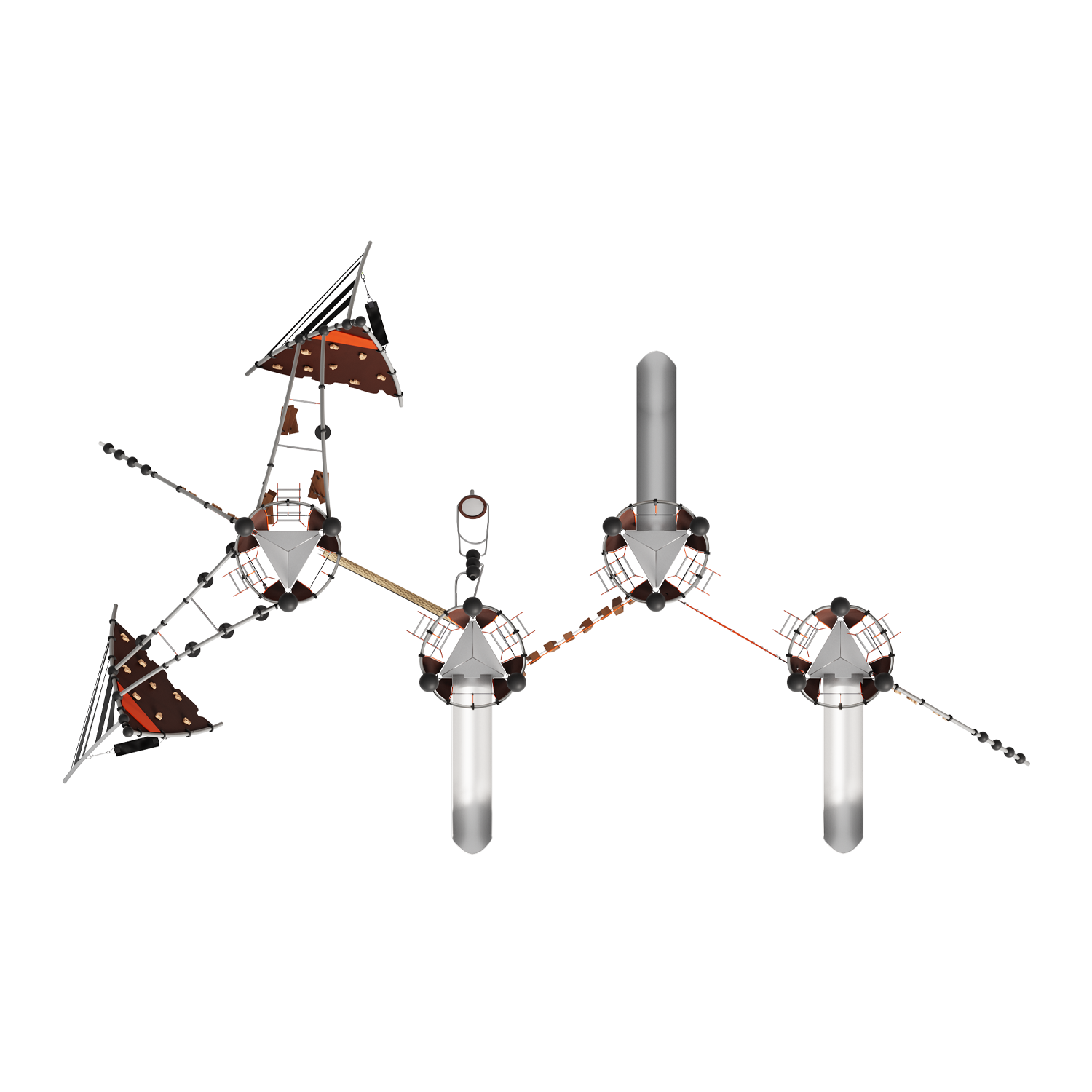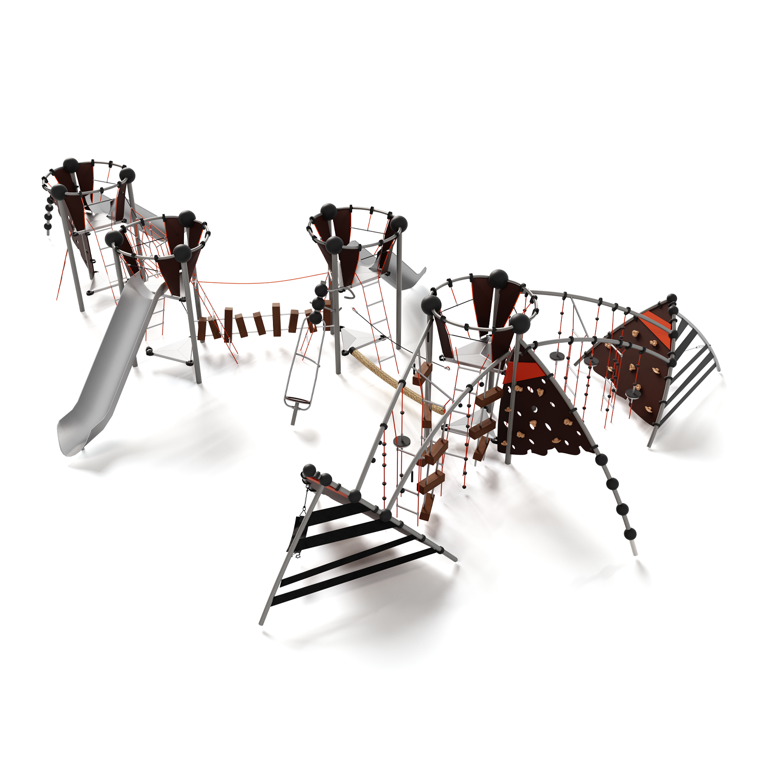 Каркас - сталь конструкционная, покрытие - цинкосодержащий грунт, окраска полимерным порошком. Горка - сталь нержавеющая толщиной не менее 2 мм, электрохимическая пассивация сварных швов. Панели - полипропилен/HPL. Канатные сети, лазы, ограждения - канат армированный 16 мм. Зацепы для скалолазания - пескобетонный композит. Конвейерная лента. Канат "Викинг".