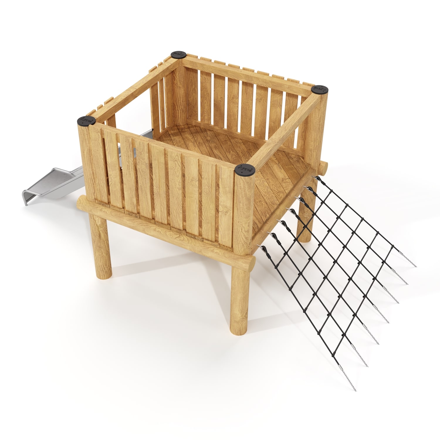 Каркас, обшивка - дерево, покрытие - антисептик, масло террасное атмосферостойкое или акриловая эмаль атмосферостойкая для древесины. Канатные сети, лазы, ограждения - канат армированный 16 мм. Горки, скаты - сталь нержавеющая толщиной не менее 2 мм, электрохимическая пассивация сварных швов.