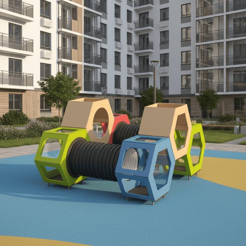 Игровой модуль для тематических игр и физического развития предназначен для детей в возрасте от 4 до 8 лет. Изделие должно представлять собой устойчивую конструкцию, обеспечивающую безопасные условия для занятий на открытом воздухе. Конструкция должна обладать высокой ударопрочностью и виброустойчивостью.В сборе представляет собой конструкцию в виде двух секций из трех шестигранных игровых элементов в сборе, четыре нижних из которых попарно соединены между собой лазом-трубой гофрированной. Четыре нижних элемента установлены на грунтозацепы.