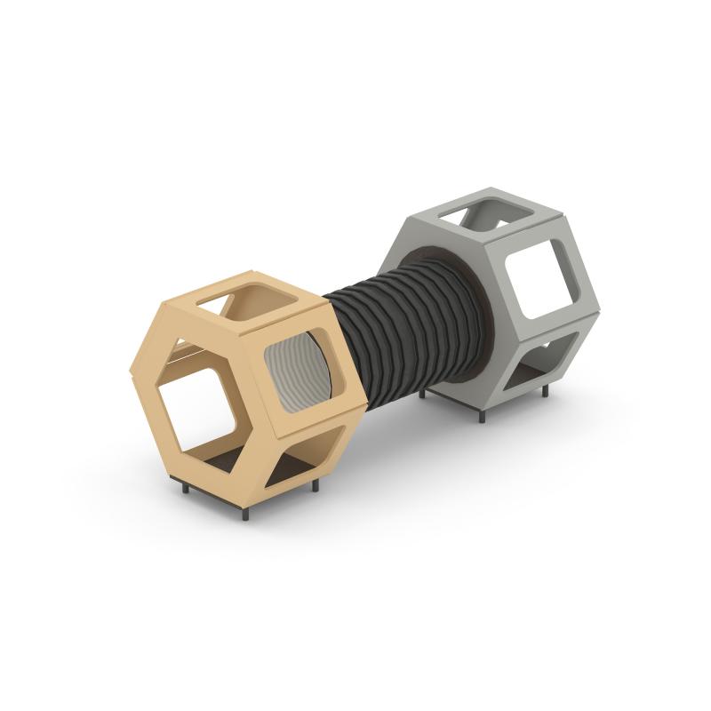 Игровой модуль для тематических игр и физического развития предназначен для детей в возрасте от 4 до 8 лет. Изделие должно представлять собой устойчивую конструкцию, обеспечивающую безопасные условия для занятий на открытом воздухе. Конструкция должна обладать высокой ударопрочностью и виброустойчивостью.В сборе представляет собой конструкцию в виде двух шестигранных игровых элементов, соединенных между собой лазом-трубой гофрированной. Установлен на грунтозацепы.