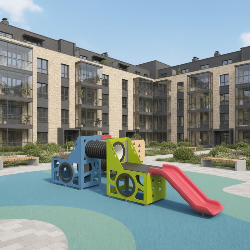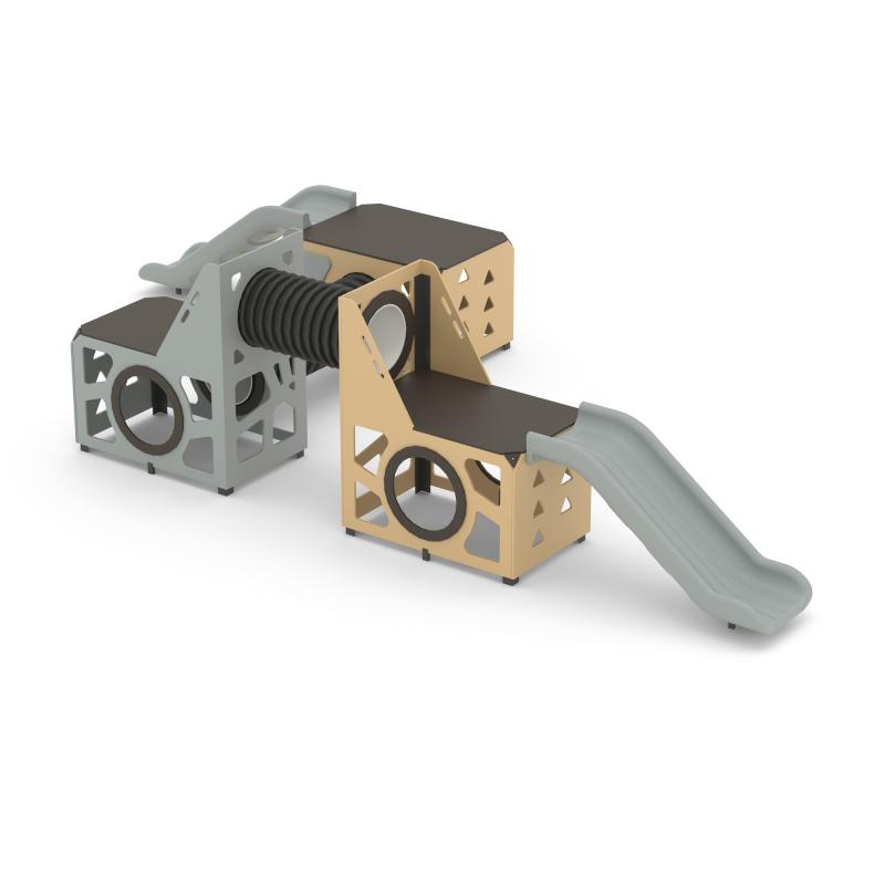 Игровой модуль для тематических игр и физического развития предназначен для детей в возрасте от 4 до 12 лет. Изделие должно представлять собой устойчивую конструкцию, обеспечивающую безопасные условия для занятий на открытом воздухе. Конструкция должна обладать высокой ударопрочностью и виброустойчивостью.В сборе представляет собой конструкцию в виде двух прямоугольных площадок с треугольным лазом, собраных со стенками с помощью уголков, установлены на грунтозацепы. Две площадки присоединены друг к другу с помощью лаза-труба. С одного из торцов прямоугольной площадки с треугольным лазом присоединена площадка прямоугольная с помощью лаза труба. С одной стороны одной из площадок с треугольным лазом установлена горка 950 мм, также еще одна горка установлена на площадке прямоугольного комплекса.Изделие устанавливается на открытых уличных участках, находящихся под контролем ответственного лица – эксплуатанта. Установка Изделия должна проводится на ровной площадке, свободной от насаждений. В зоне приземления должно быть ударопоглощающее покрытие (песок, древесные опилки) минимальной толщиной 300 мм.