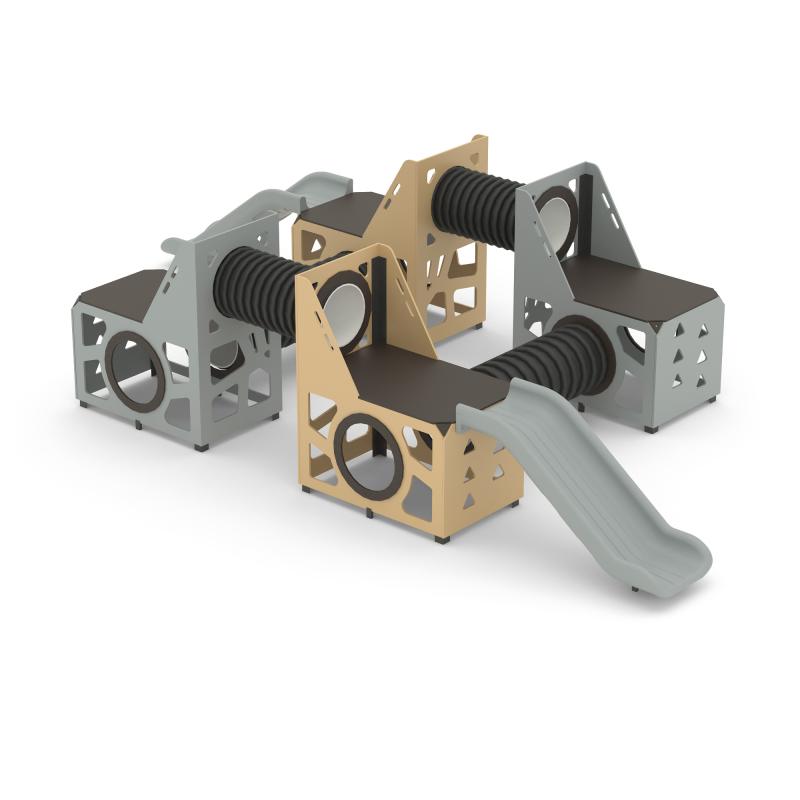 Игровой модуль для тематических игр и физического развития предназначен для детей в возрасте от 4 до 12 лет. Изделие должно представлять собой устойчивую конструкцию, обеспечивающую безопасные условия для занятий на открытом воздухе. Конструкция должна обладать высокой ударопрочностью и виброустойчивостью.В сборе представляет собой конструкцию в виде четырех прямоугольных площадок с треугольным лазом, собраных со стенками с помощью уголков, установлены на грунтозацепы. По две площадки присоединены друг к другу с помощью лаза-труба в верхней части, в месте треугольного лаза. Также площадки присоединены с одной из сторон друг с другом с помощью лаза труба по торцевой длинной стенке. С двух противоположных стороны по диагонали к площадкам с треугольным лазом присоединены по одной горка 950 мм (всего 2 штуки).Изделие устанавливается на открытых уличных участках, находящихся под контролем ответственного лица – эксплуатанта. Установка Изделия должна проводится на ровной площадке, свободной от насаждений. В зоне приземления должно быть ударопоглощающее покрытие (песок, древесные опилки) минимальной толщиной 300 мм.