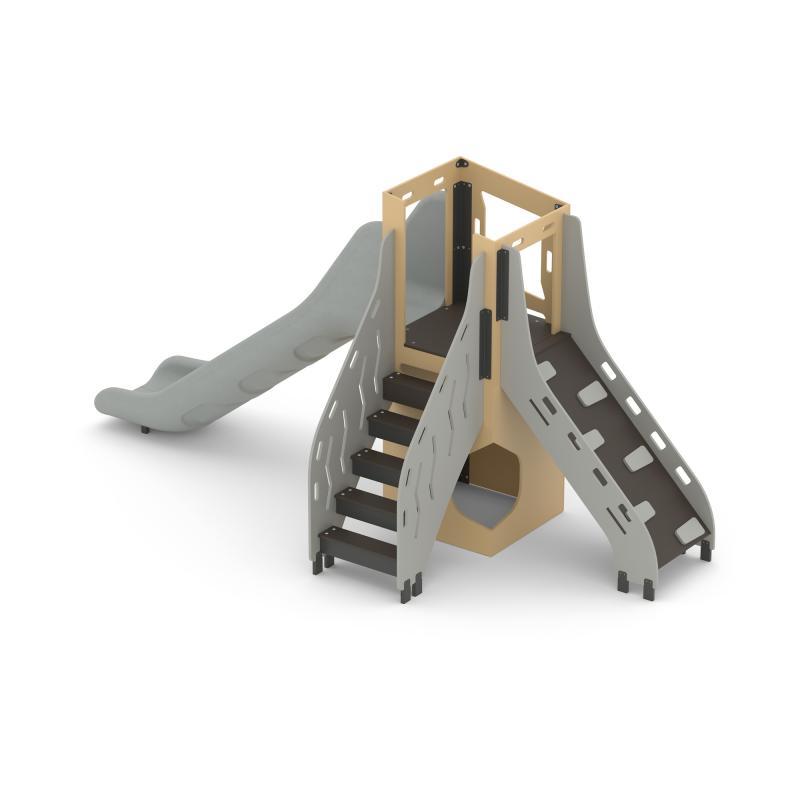 Игровой модуль для тематических игр и физического развития предназначен для детей в возрасте от 4 до 12 лет. Изделие должно представлять собой устойчивую конструкцию, обеспечивающую безопасные условия для занятий на открытом воздухе. Конструкция должна обладать высокой ударопрочностью и виброустойчивостью.В сборе представляет собой конструкцию в виде прямоугольного комплекса-башни по центру, к которому с трех сторон присоединены: лестница, горка 1250 мм и лаз напротив горки.Изделие устанавливается на открытых уличных участках, находящихся под контролем ответственного лица – эксплуатанта. Установка Изделия должна проводится на ровной площадке, свободной от насаждений. В зоне приземления должно быть ударопоглощающее покрытие (песок, древесные опилки) минимальной толщиной 300 мм.